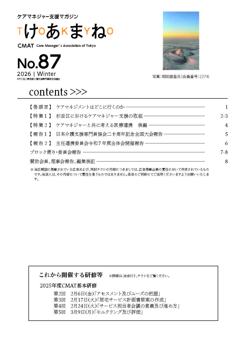 この度当会は「けあまねTOKYO」87号を発行いたしました。その一部をHP上に掲載いたします。(当会会員の方は、会員ページから入って頂くと広報誌全頁をご覧いただけます。)