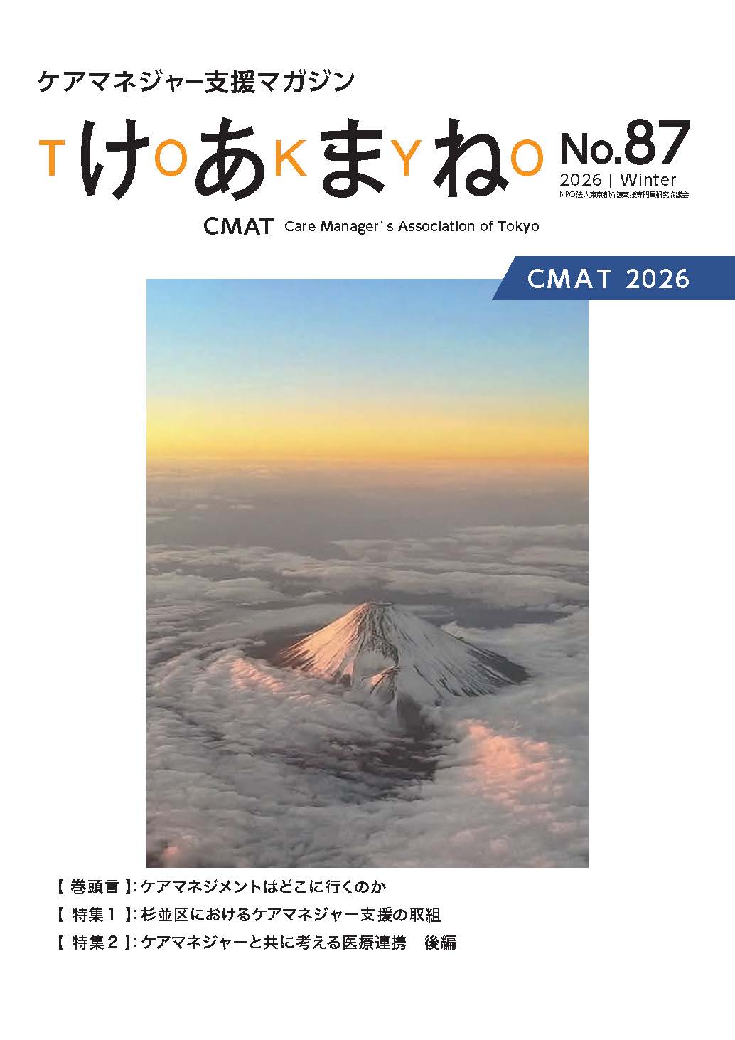 この度当会は「けあまねTOKYO」87号を発行いたしました。その一部をHP上に掲載いたします。(当会会員の方は、会員ページから入って頂くと広報誌全頁をご覧いただけます。)